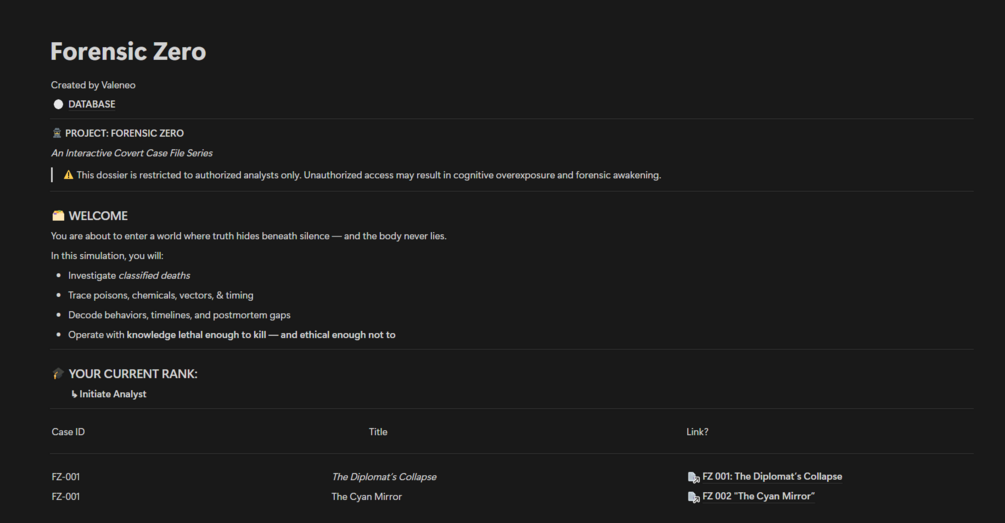 Forensic Zero is a playable training simulation that drops you into the shoes of an intelligence-grade forensic analyst. Navigate a series of interactive case files, decode classified evidence, and uncover the truth behind tactical operations. Designed for beginners, this module blends forensic science, tactical reasoning, and psychological profiling in a gamified, choose-your-path format.