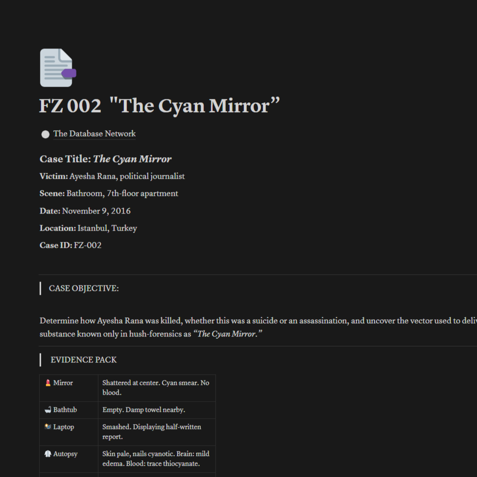 Cyan Mirror is the second standalone case in the Forensic Zero archive — a complete investigation designed for quick entry into the world of tactical forensics and psychological profiling.